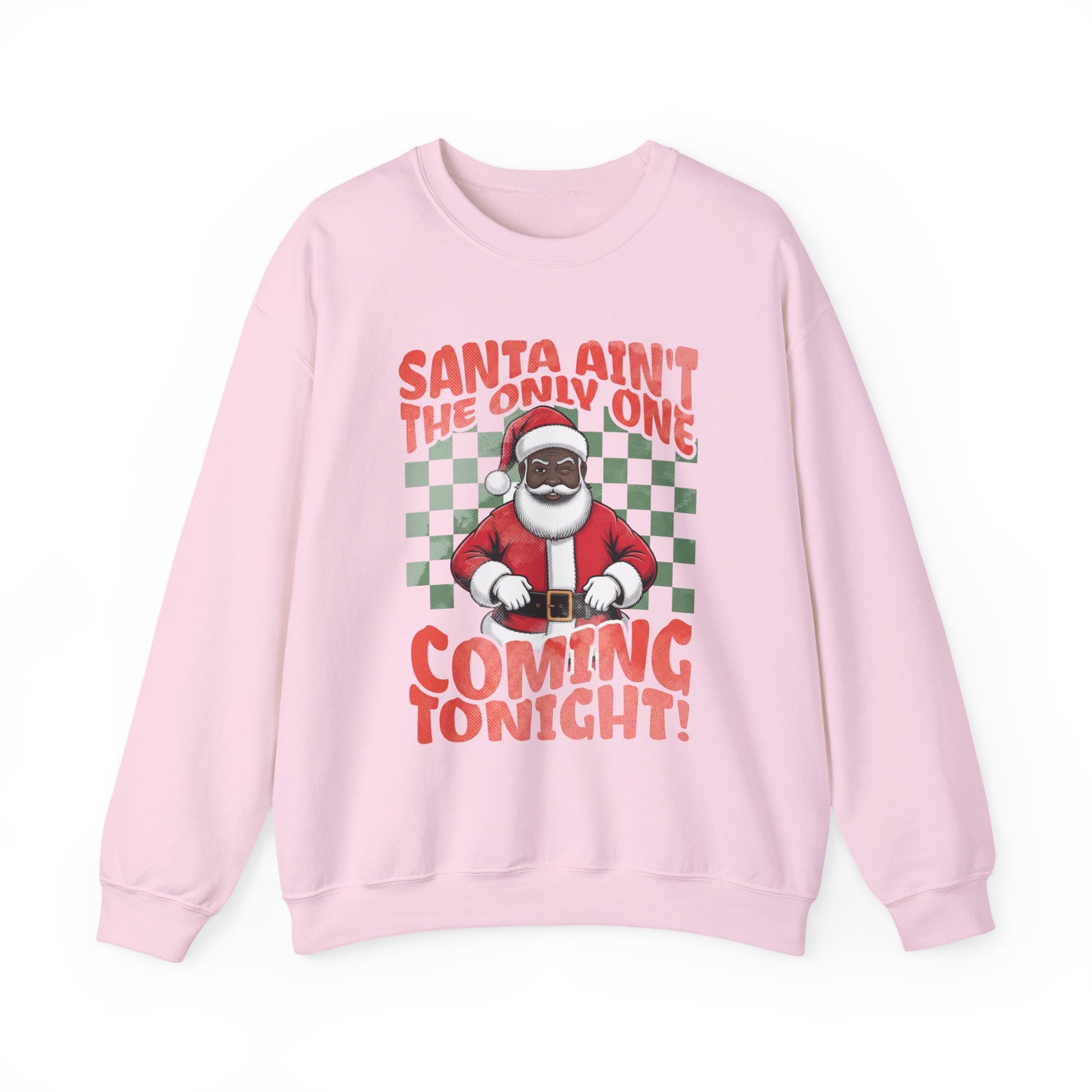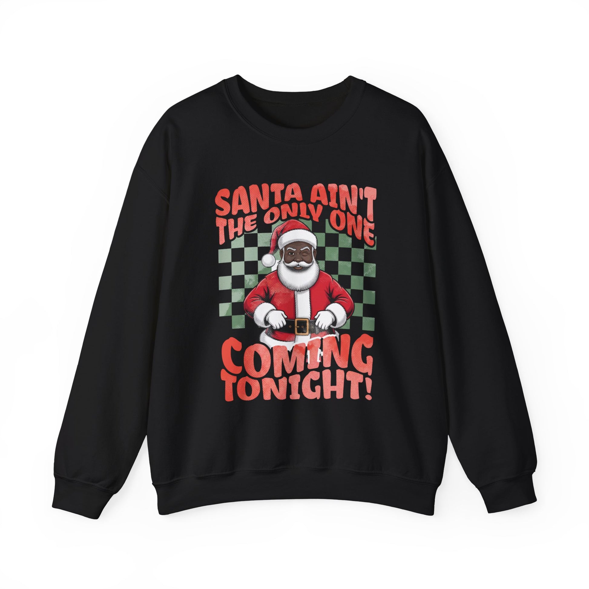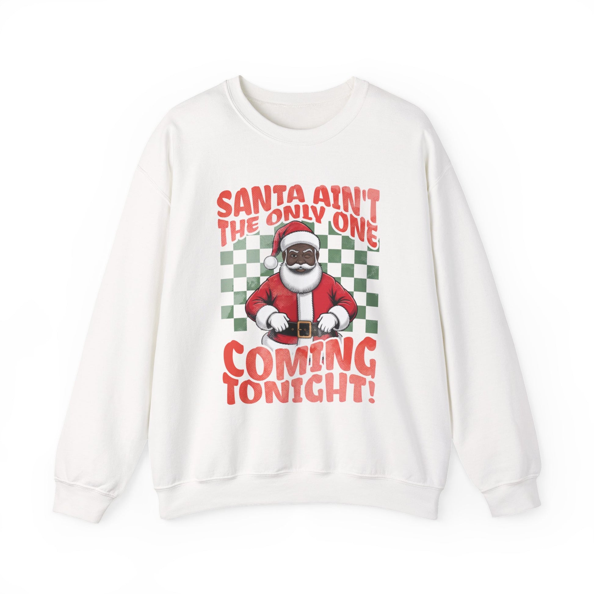 This cozy crewneck sweatshirt brings a playful, confident energy to holiday moments. A bold, retro-style graphic shows a smiling, bearded Santa figure against a checkerboard field with the cheeky line, “Santa ain’t the only one coming tonight!” The medium-heavy 50/50 cotton-poly fabric feels warm without bulk, and the classic fit and ribbed crew neckline sit comfortably for lounging, decorating, or grabbing hot cocoa. Durable double-needle stitching and tear-away neck label keep it wearable season after season. Wear it to holiday hangs, casual winter nights, or whenever you want to spark laughs and start conversations — a relaxed statement piece that blends comfort with personality. Product features - Medium-heavy 50/50 cotton-poly blend (8.0 oz/yd²) for warmth and durability - Classic crewneck fit with ribbed knit collar to retain shape - Double-needle stitching at shoulder, armhole, neck, waistband and cuffs for long-lasting wear - Embroidered or printed decoration options; DTF inner neck labels and DTG prints - Tubular-knit construction (no side seams) and OEKO-TEX certified dyes; made in Nicaragua Care instructions - Machine wash: cold (max 30C or 90F) - Non-chlorine: bleach as needed - Tumble dry: low heat - Do not iron - Do not dryclean